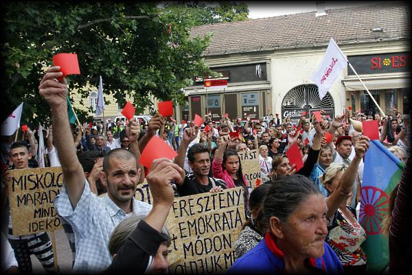 A roma önkormányzat miskolci demonstrációja 2014. június 25-én. A demonstrálók a telepek felszámolásáról szóló helyi rendelet visszavonását követelték – MTI/Vajda János