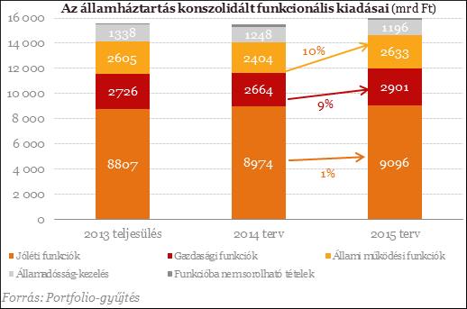 Az állami működési funkciókra fordított kiadások gyarapodása nem is lehet kérdéses akkor, amikor az állami alkalmazottak növekvő számát vizsgáljuk (igaz, köztük vannak a segélyek helyett közmunkát „elnyerők” is). Az Orbán-rendszer támaszai: a szolgáló-nemesség (ld. I. Péter) funkcióját betöltő megfélemlített, de megfizetett állami alkalmazottak és az állam tenyeréből közbeszerzéseket nyerő vállalkozók. A rájuk fordított milliárdok (például a rendvédelmi dolgozók járandósága – ahogyan egy rendes diktatúrában illik) növekedni fognak, sőt az arányuk is, miközben a jóléti funkciókra fordított kiadások mindössze egyetlen százalékkal növekszenek, amiben az eladósodott kórházak adósságrendezése és a nyugdíjak értékmegőrzése játszik szerepet.