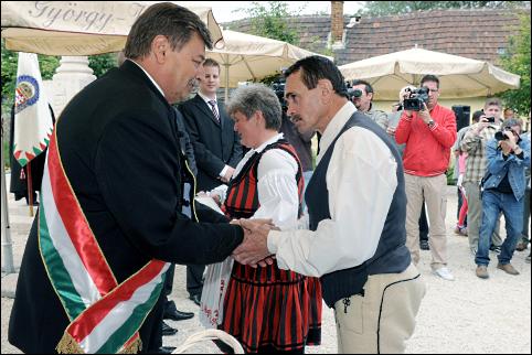 Szabolcs Attila, Budafok-Tétény polgármestere gratulál Bencze Mózesnek és feleségének az ünnepi állampolgársági eskü alkalmából a nemzeti összetartozás napján rendezett ünnepségen a nagytétényi országzászlónál, ahol mintegy ötvenen tettek állampolgársági esküt szombaton