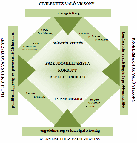 A negyedik dimenzió a szervezethez való viszony. A magyar rendőrség hadseregnek képzeli magát, ezért úgy épül fel és úgy működik, mintha katonaság lenne – az ilyen szervezetet az irodalom paramilitárisnak nevezi. Nemcsak arról van szó, hogy a főtisztek katonai rangjelzésekkel páváskodnak, de mindenekelőtt arról, hogy az ilyen szervezet rendkívül zárt és merev rendszer, amely nem képes kezelni a változásokat, olyan szervezet, amelyben a hatalom és a dicsőség a felső, a munka és a felelősség az alsó szintek felé áramlik. Az egyetlen csatorna, amelyen az információk és a probléma-megoldási ötletek áramlanak, az a parancs. Semmi sem történhet parancs nélkül vagy a parancs ellenére – ha mégis előfordulna, akkor az az esemény nem is létezik. Ebben a szervezetben a beosztott semmi, a vezetői pozíció birtokosa pedig minden. A magyar rendőrség különös sajátossága, hogy körömszakadtáig ragaszkodik a szovjet rendőrségtől átvett kettős struktúrához. Az egyik struktúra (legalábbis látszólag) funkcionális és a beosztások szerint alakul, a másik pedig egy absztrakt pozíciót rögzít és a rendfokozatok szerint rendeződik. A rendfokozatok akkor is megőrzik a korábban elnyert pozíciót, ha ezt már elvesztette az illető. De ez még semmi, mert valaki a rendfokozatban akkor is képes emelkedni, ha az adott ember (többnyire férfi), már régen nyugdíjban van. Így lett tábornok nem is egy volt rendőr az egykori Rendőrtiszti Főiskolán. Az elnyert rang arra is jó, hogy a nyugdíjból bármikor vissza lehessen térni a szervezet élére.