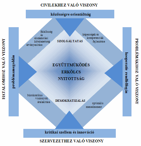 Ha mind a négy dimenzióban egyidejűleg hajtjuk végre a változtatásokat, akkor kialakulhat a szolgáltató rendőrség és a demokrácia számára nélkülözhetetlen foglakozási kultúra, aminek a struktúráját a 2. ábra mutatja be.
