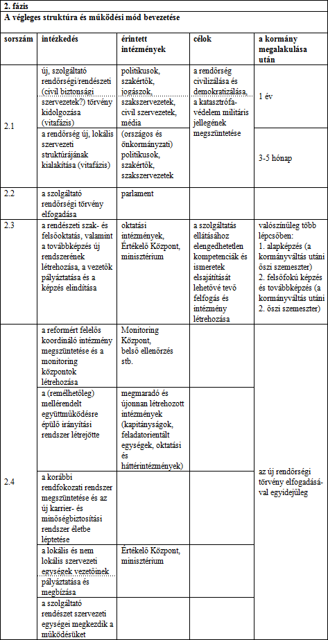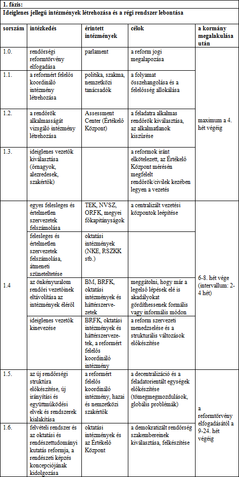 Véleményem szerint a reformot négy fázisban lehet megvalósítani. Az első fázis az előkészítésé, ekkor kell kialakítani a demokratikus erők konszenzusát a reform legfontosabb kérdéseit illetően. Ennek alapja az a tétel, hogy nincs jobb- vagy baloldali rendőrség, csakis demokratikus vagy antidemokratikus rendőrség van. A konszenzust mindenképpen létre kell hozni a választásokig, mert csak ebben az esetben lehet azonnal hozzákezdeni a reformhoz. A reform haladéktalan elindítása véleményem szerint elengedhetetlen, és együtt kellene végbemennie a közigazgatási és igazságügyi/igazságszolgáltatási, ügyészségi reformmal, mivel a megreformált rendőrség nem tudna jól működni a jelenlegi vagy a 2010 előtti önkormányzati és igazságszolgáltatási rendszerben. Lehetetlen lenne a rendőrség reformja a nyomozásokért felelős ügyészség reformja és megtisztítása nélkül is.