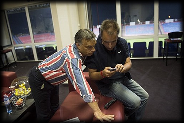 Az elemző és az elemzett a 11-es VIP-szobában, a háttérben stadionlelátókkal